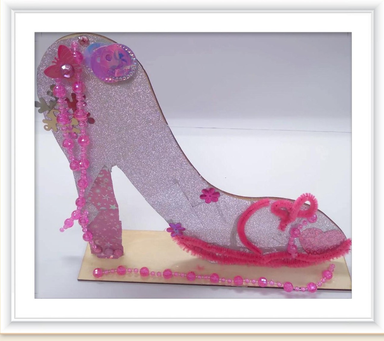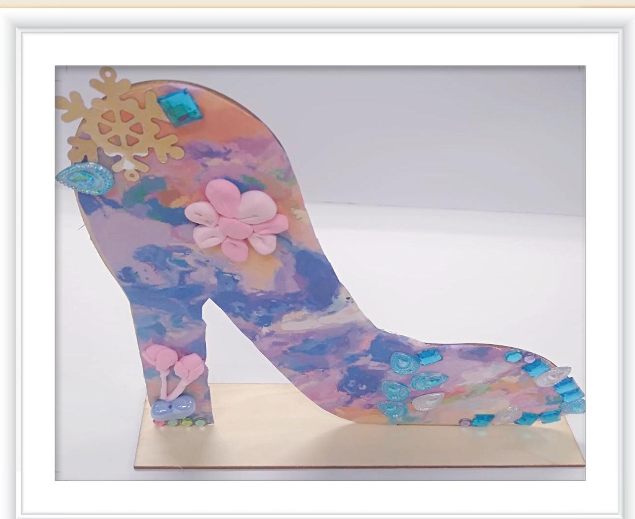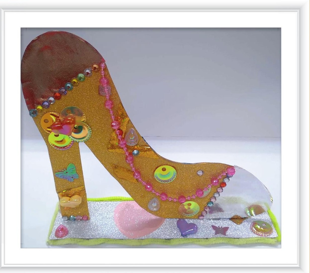 五年級學生以木板為基底,創作出立體《高跟鞋》作品。
