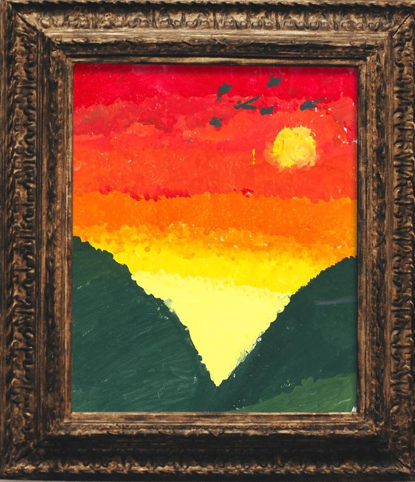 五年級學生以點描畫技法創作《日與海》,運用細緻的點狀色彩層層疊加,描繪夕陽映照海面的景致。