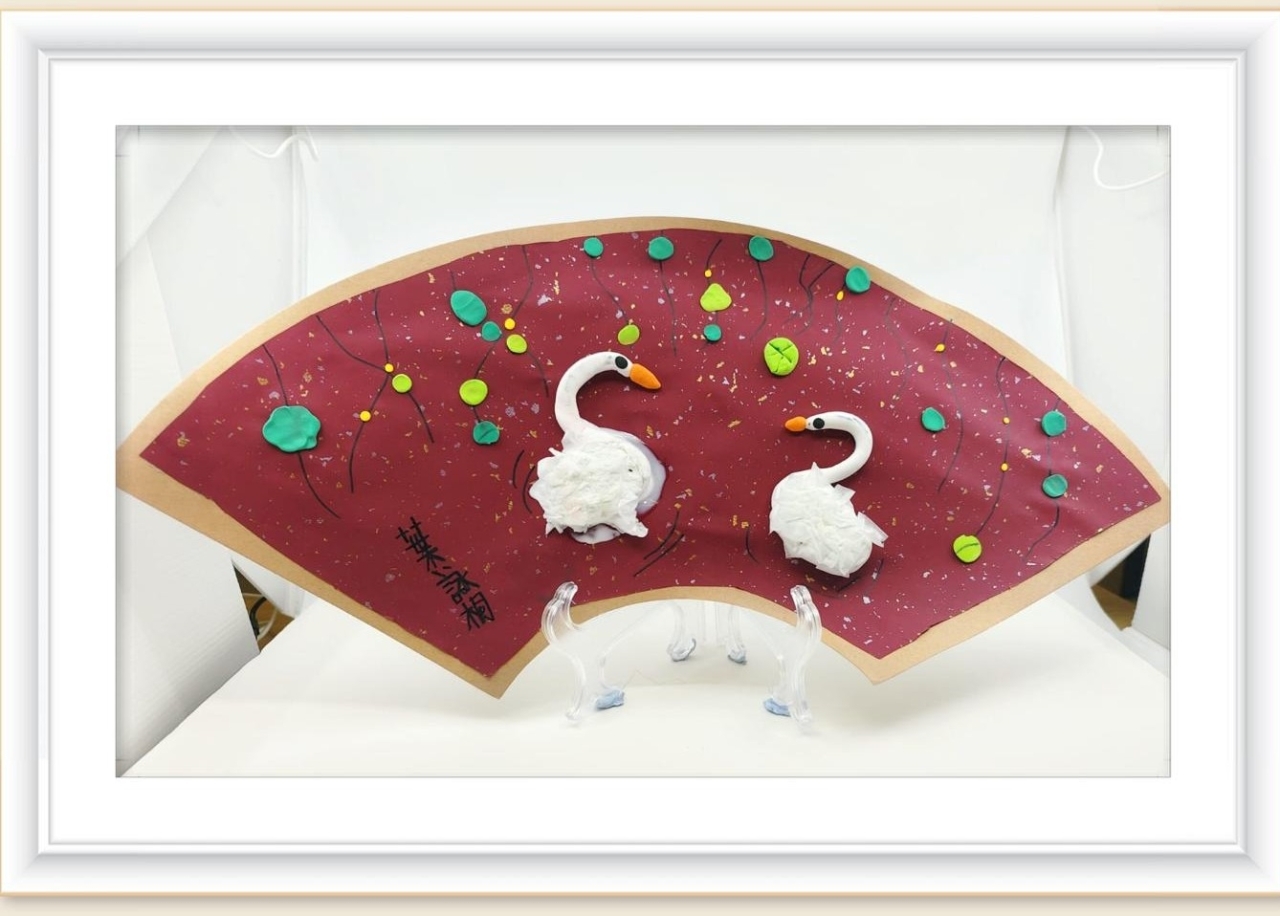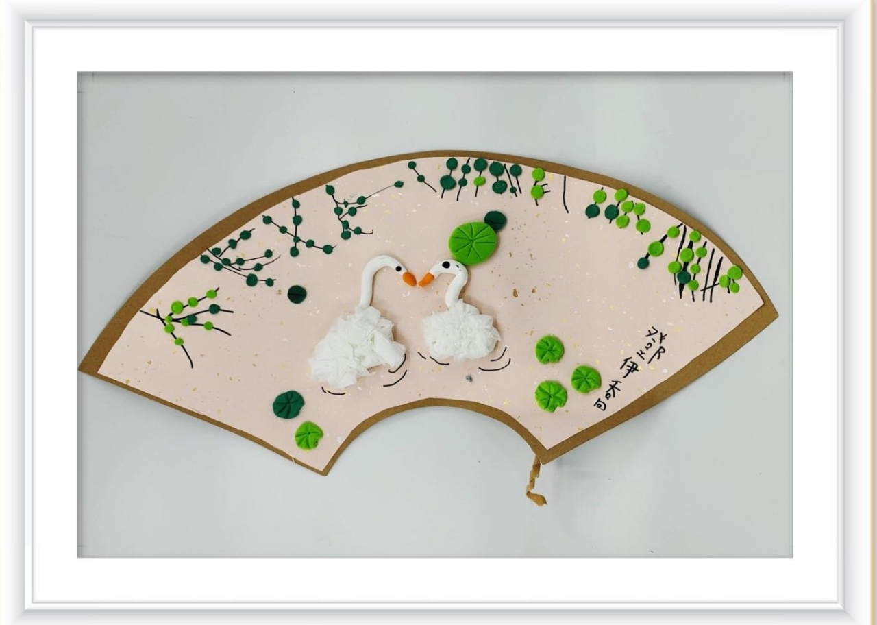 二年級學生以中式紙扇為畫布,結合黏土立體藝術創作出《詠鵝》。