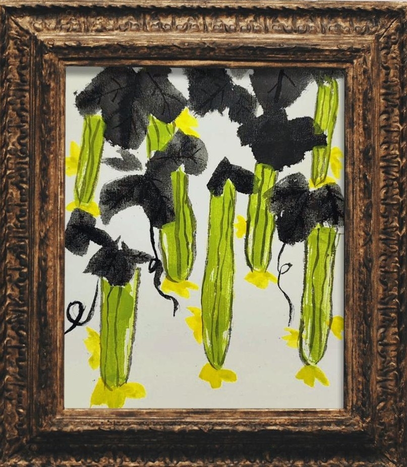 線條流暢柔韌,富有彈性,將瓜與葉自然連結,呈現出水墨畫特有的韻味與節奏。
