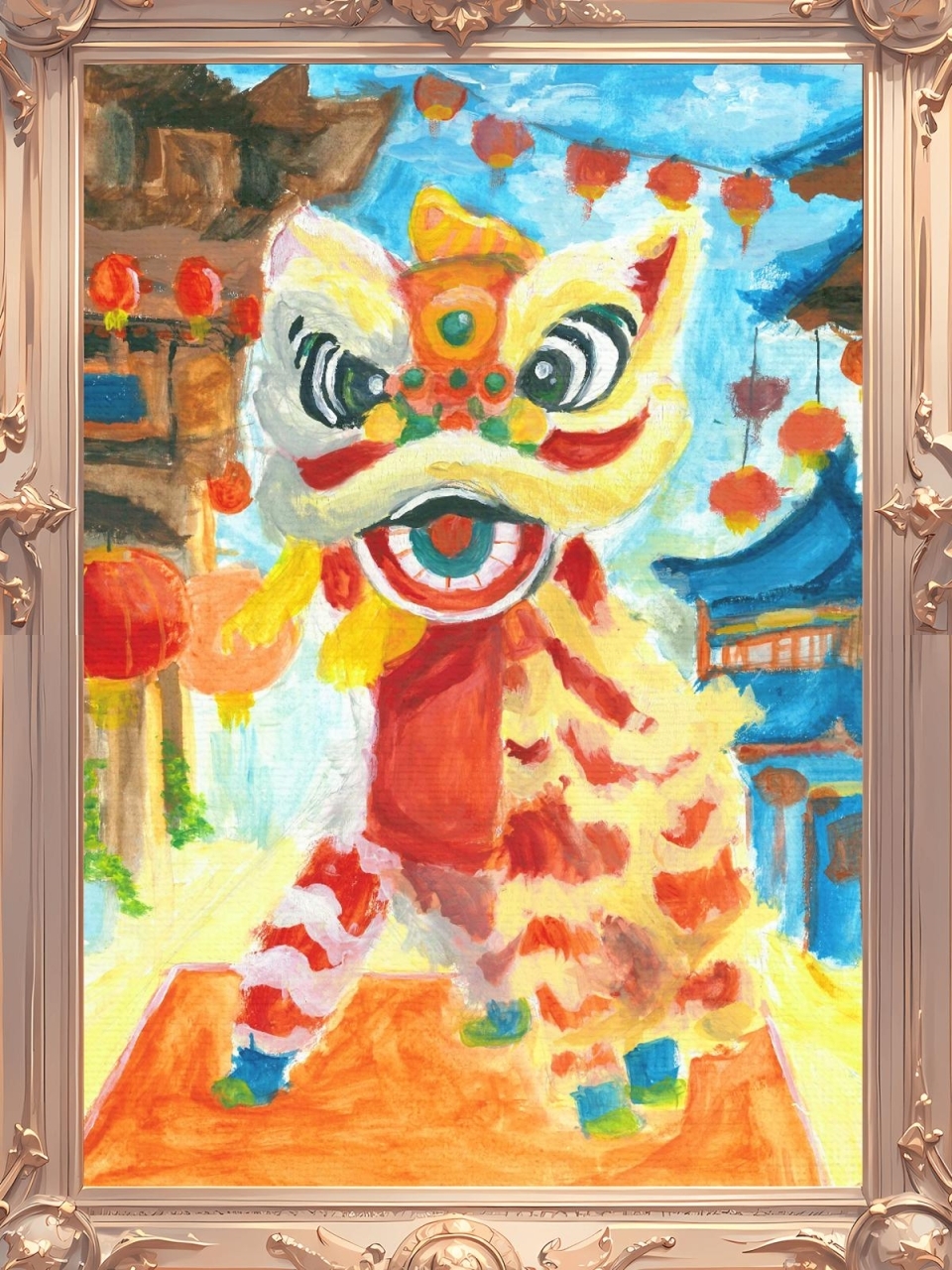 六年級學生以鮮明色彩與動感筆觸描繪出熱鬧非凡的《舞龍舞獅》場面。