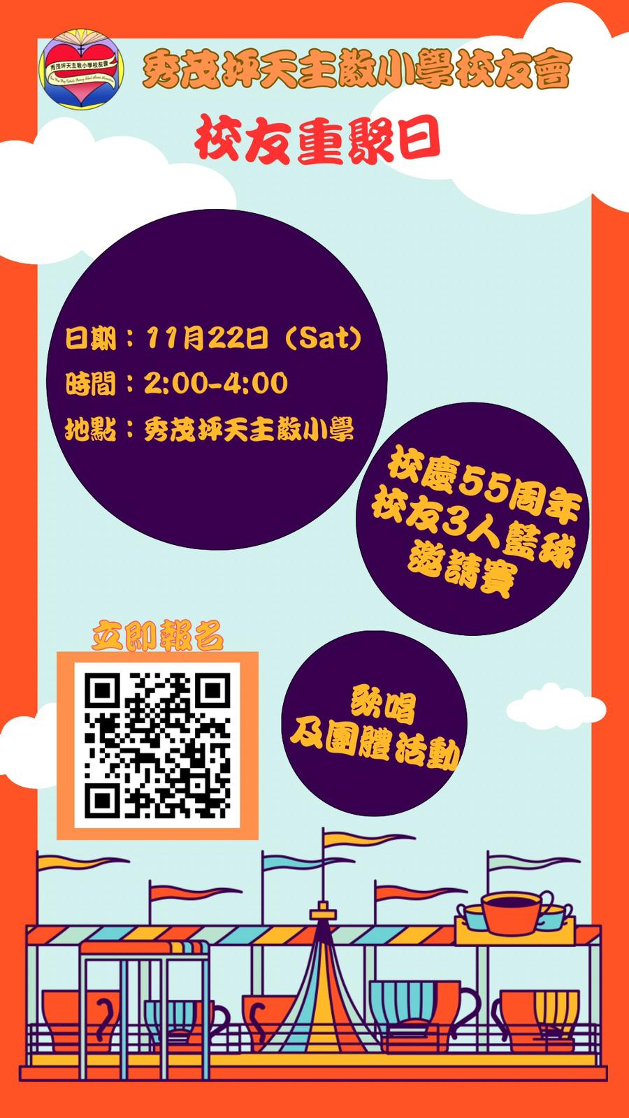 每年的十月,都會舉行校友重聚日,透過重聚日與老師、同學分享在小學時的點滴,同時分享新生活中的開心與困難。在不同年齡的校友一起活動、 聊天中,相互把秀天的精神傳承下去。