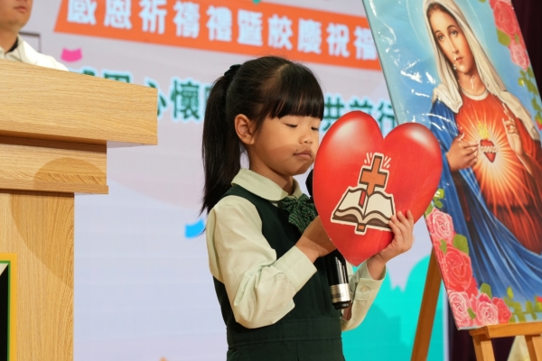 其後,由一至六年級學生代表依次奉上 象徵天主教教育五大核心價值的盾牌及祈禱文。